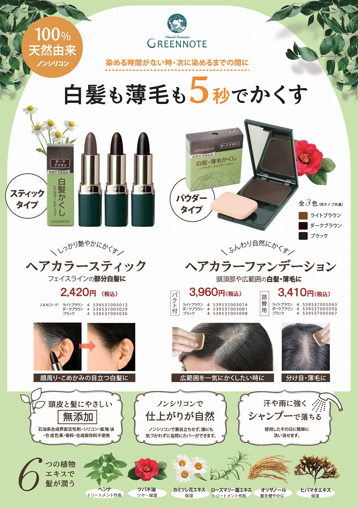自然派の研究から生まれた国内でも珍しい、ノンシリコン、石油系成分フリーの白髪・薄毛かくしシリーズです。天然鉱物に天然アミノ酸をコーティングすることで、悪目立ちせずに自然にカバーすることが出来ます。